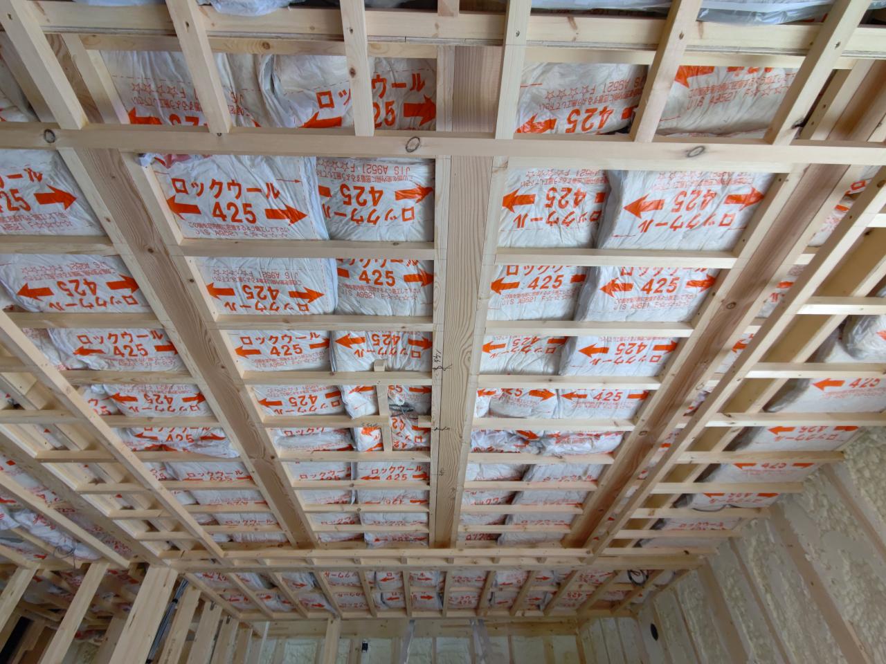 香川県高松市で夢工房新築工事建築中 一階天井ロックウール施工。 見学希望の方お問い合わせください。