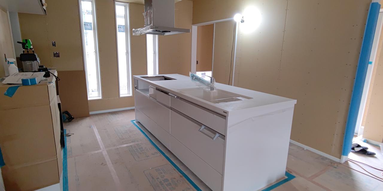 香川県高松市で夢工房新築工事建築中見学希望の方はお気軽にお問い合わせください。システムキッチン アイランドキッチン施工